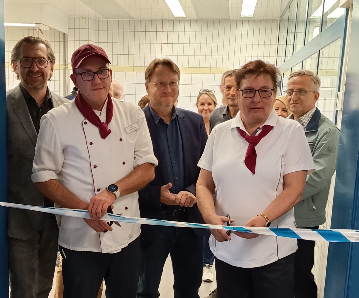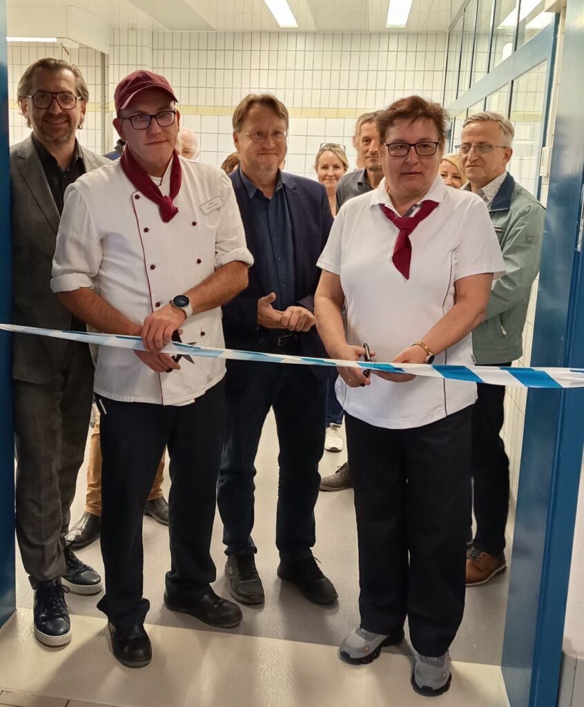 BU: Geschäftsführer René Klinger und Landrat Robert Sesselmann weihen zusammen mit Klinikmitarbeitern die neue Küche ein.