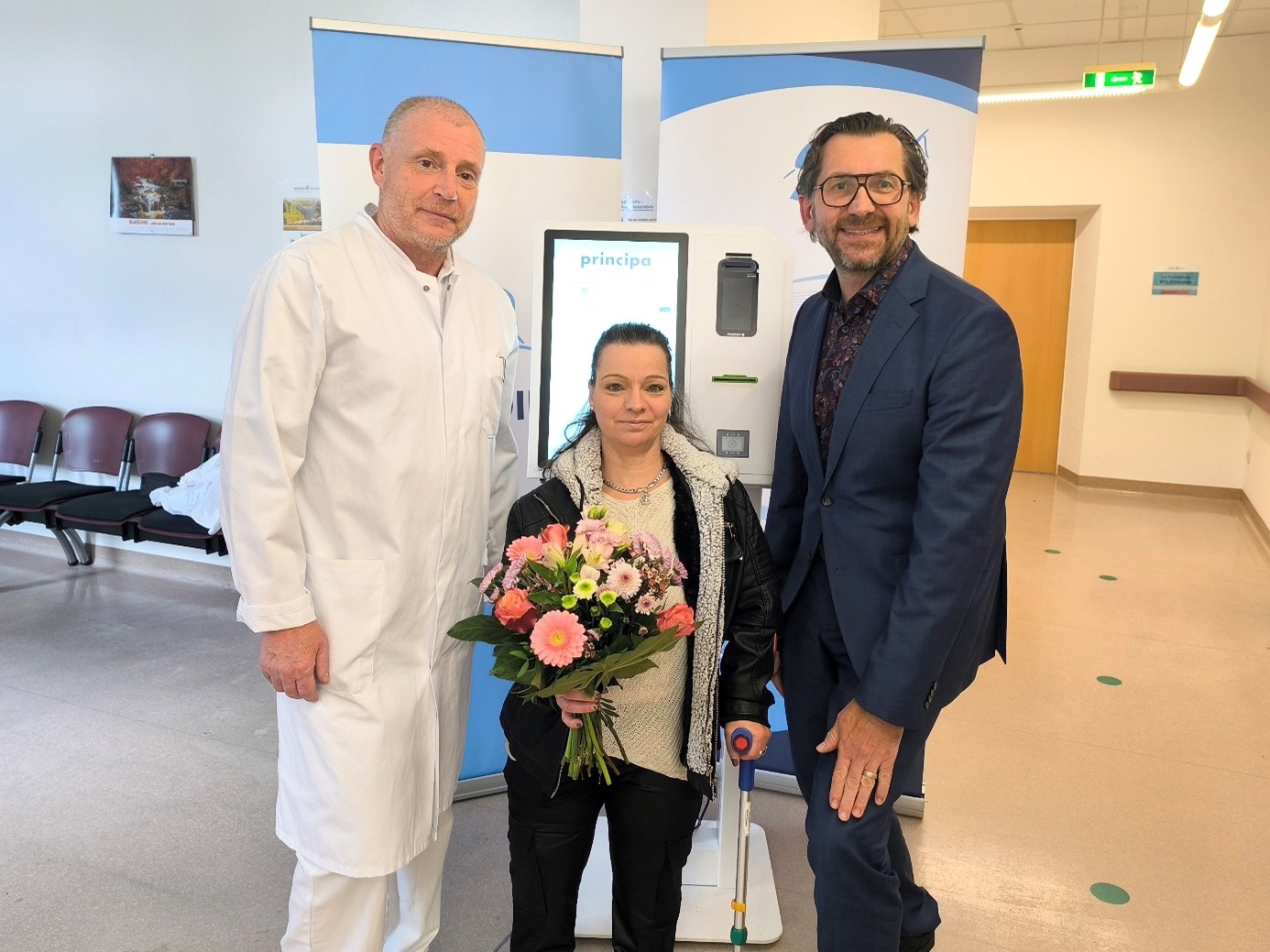 Klinikgeschäftsführer René Klinger begrüßt die erste Patientin Yvonne Glau der neuen Online-Terminierung.