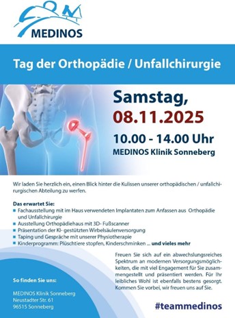 Am 8. November 2025 lädt die Abteilung Orthopädie und Unfallchirurgie der MEDINOS Klinik Sonneberg von 10.00 bis 14.00 Uhr zum Tag der offenen Tür ein. Besucherinnen und Besucher dürfen sich auf spannende Einblicke in modernste Diagnostik und innovative Behandlungsmöglichkeiten freuen.