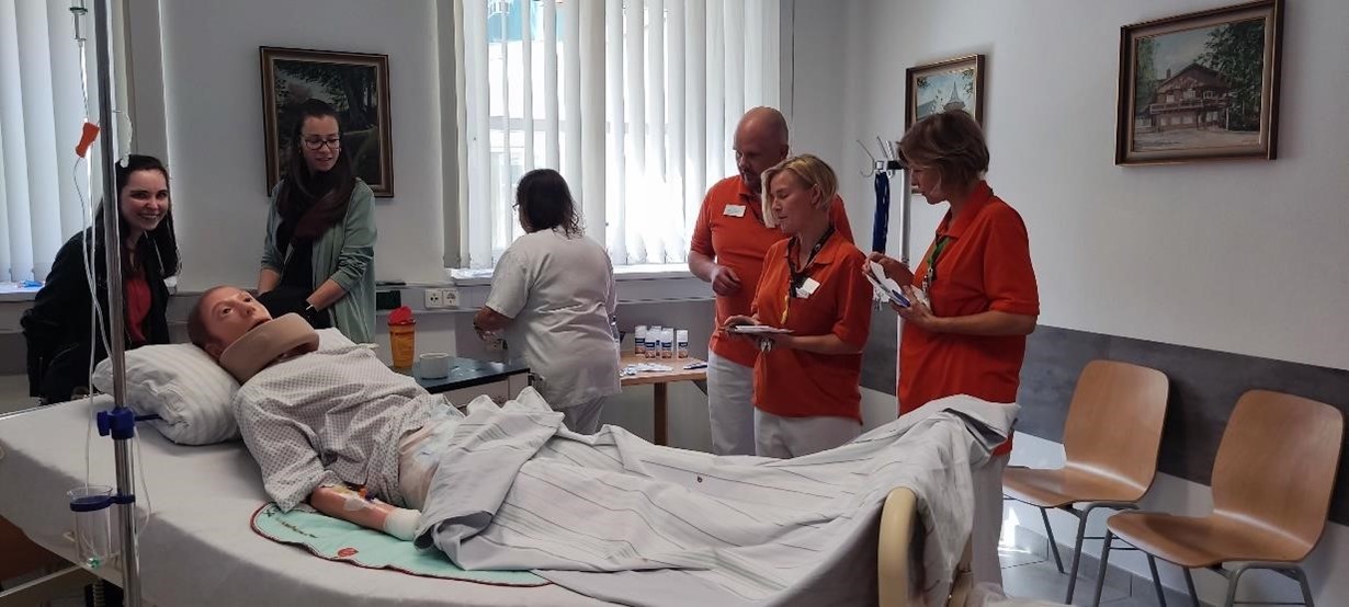 An drei weiteren Stationen wurden gezielte Hygienemaßnahmen am Patientenbett demonstriert, z. B. die Händedesinfektion vor der Berührung einer Wunde am Patienten oder die konsequente Händedesinfektion vor der Verabreichung eines Medikaments über einen Zentralvenenkatheter oder einen peripheren Venenkatheter.