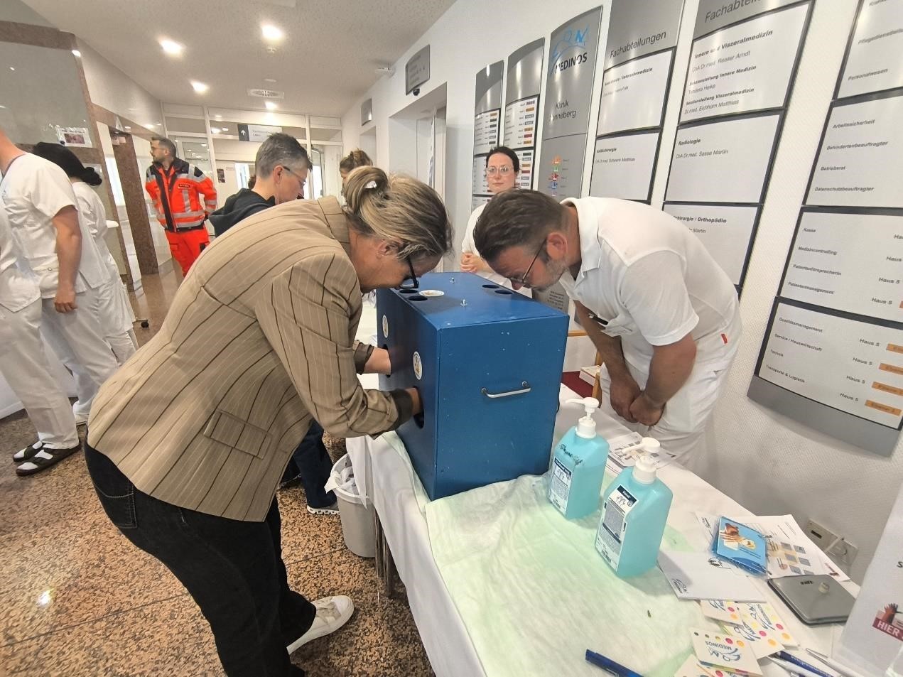 Insgesamt neun spannende und interaktive Stationen hatte das Hygiene-Team organisiert. An drei Stationen konnten die Besucher die richtige Handdesinfektion üben. Dabei fiel auf: Selbst sehr erfahrenes medizinisches -und Pflegepersonal führt eine Handdesinfektion nicht immer richtig durch. Deshalb ist es notwendig, dies immer wieder zu üben und Benetzungslücken zu erkennen. Mithilfe einer Schwarzlichtlampe konnten diese Lücken auf der Veranstaltung sichtbar gemacht werden und sorgten für manchen Überraschungseffekt.