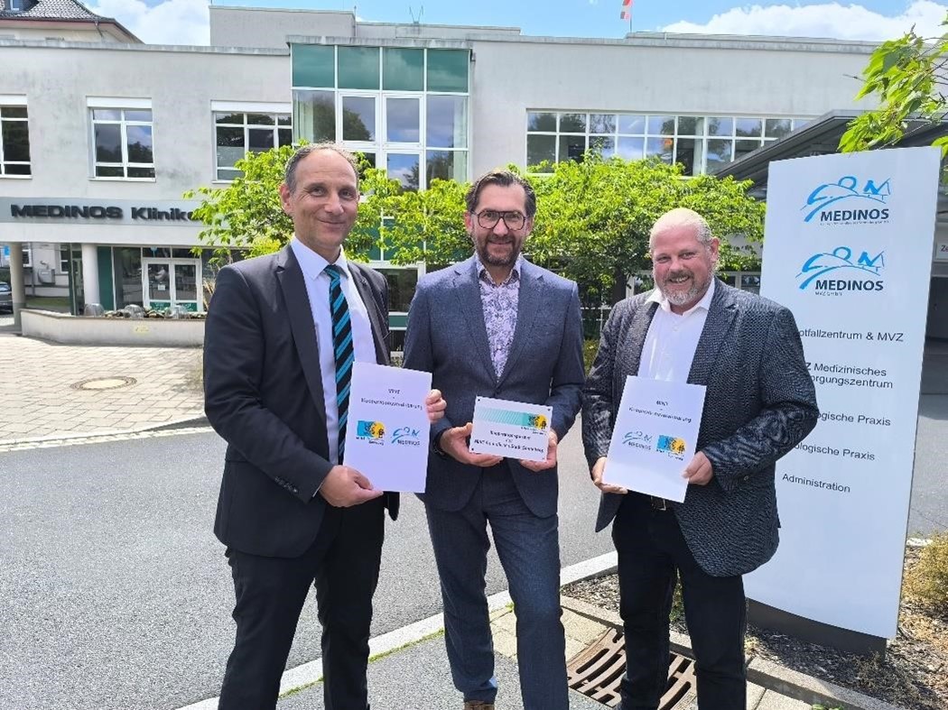 Prokurist und Leiter der Administration Matthias Kempf, Geschäftführer René Klinger und Stellvertretender Bürgermeister Christian Dressel (von links nach rechts)Abb. 2: Vor der MEDINOS Klinik Sonneberg